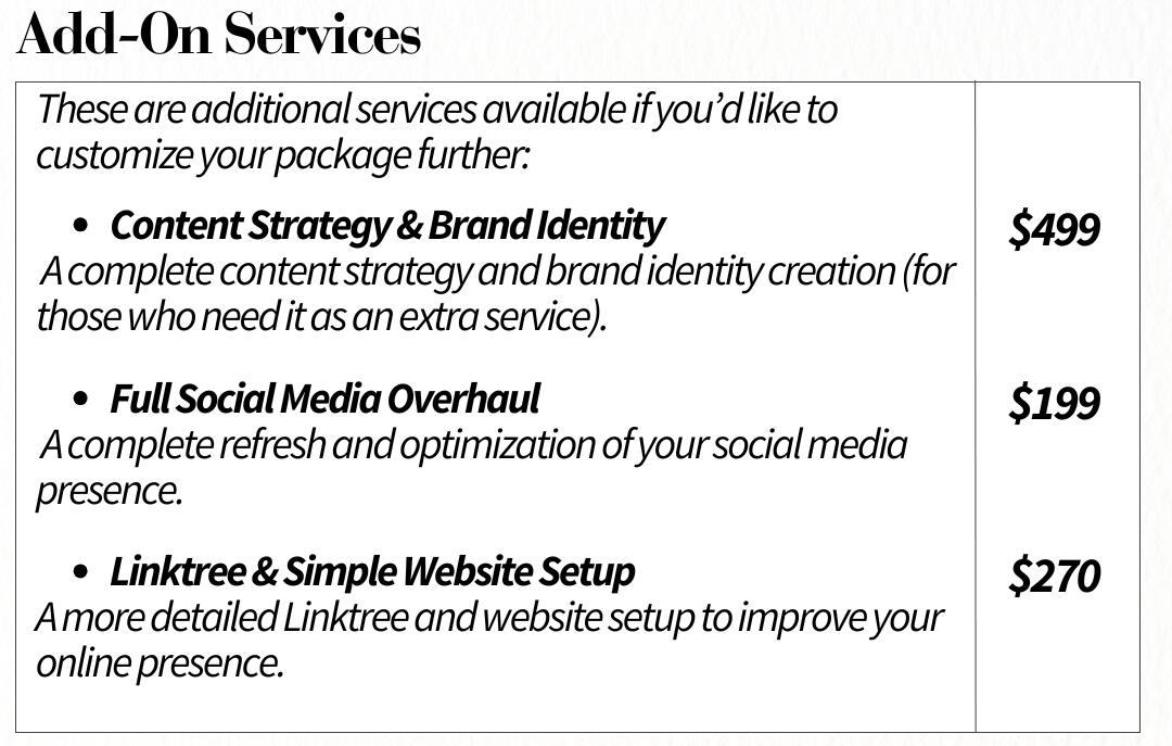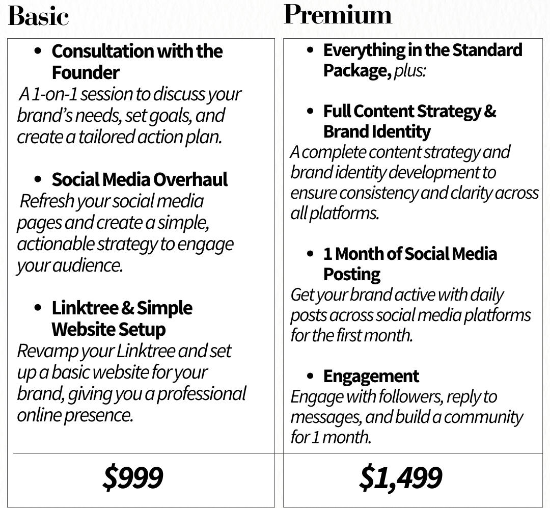 A personalized, in-depth 1-on-1 session where we’ll dive into your brand’s unique challenges and opportunities. We will identify key goals, discuss the vision for your brand, and create a tailored action plan that aligns with your values and objectives. A strategic roadmap to guide your next steps
